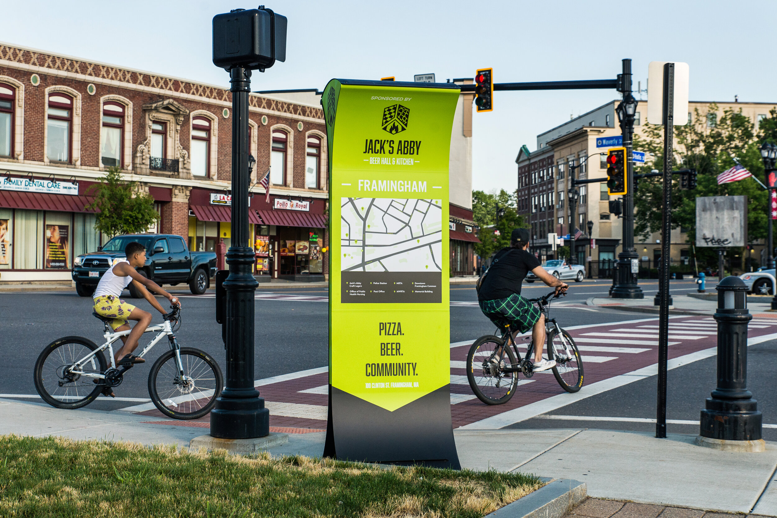 The Jack’s Abby logo is displayed on the sign, noting that their popular brews are “proudly made in Framingham”. The colorful, eye-catching vinyl design also features the seal of the City of Framingham and an easy-to-read map highlighting popular sights and key locations in the neighborhood.