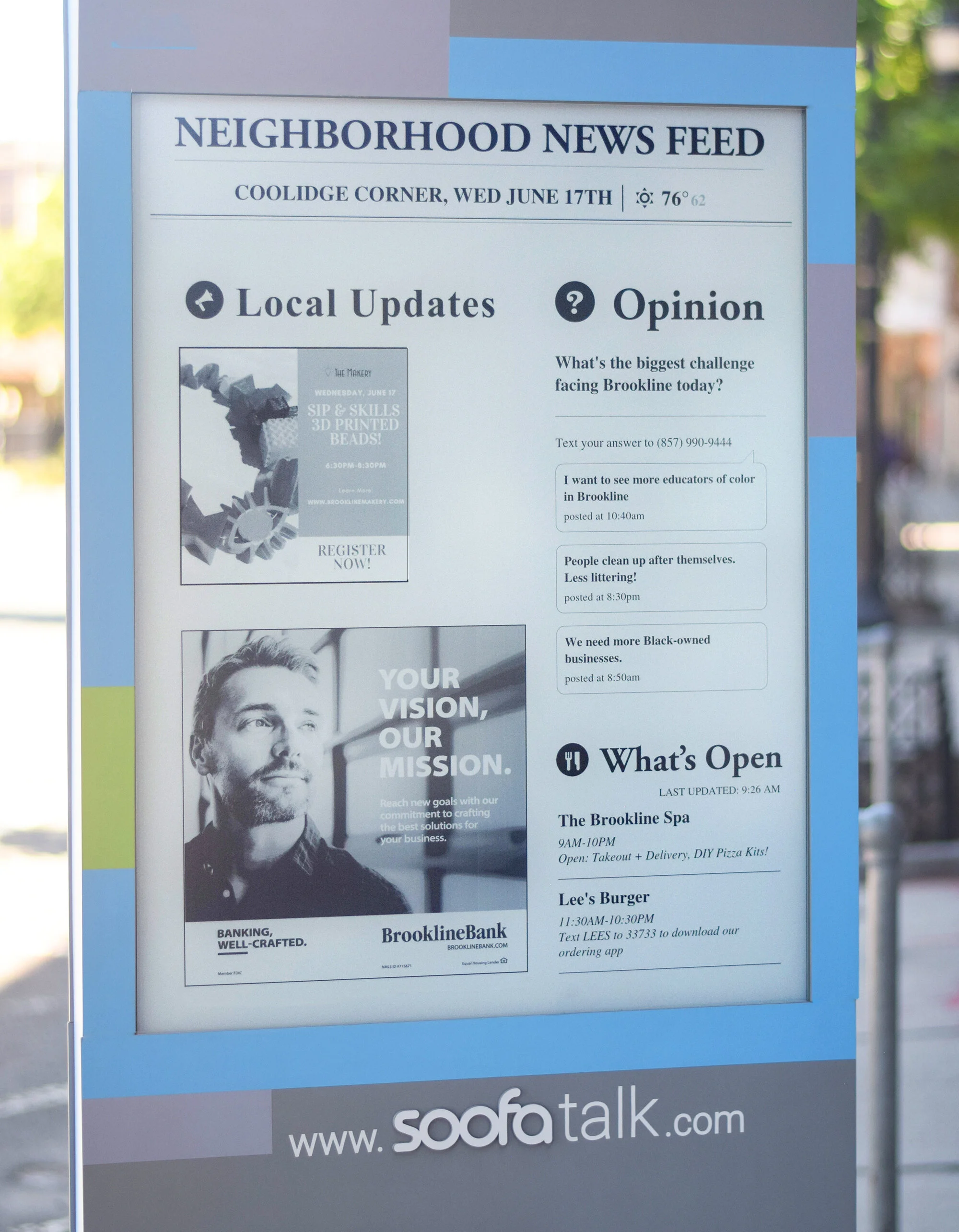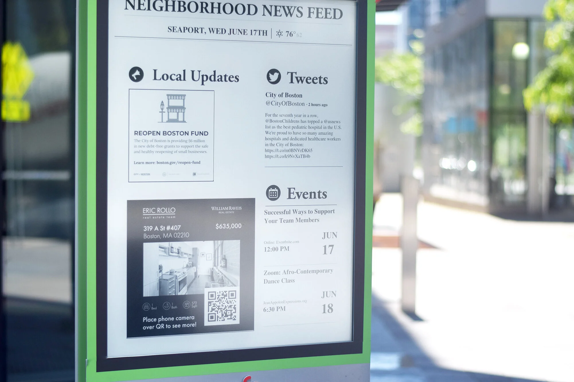 From our primary user surveys and observations, people walking by love seeing local business updates and news, hyper-local community content, and helpful information like weather and real-time transit. This type of information creates a habit for people to look at the Signs again and again, since there is always new information.