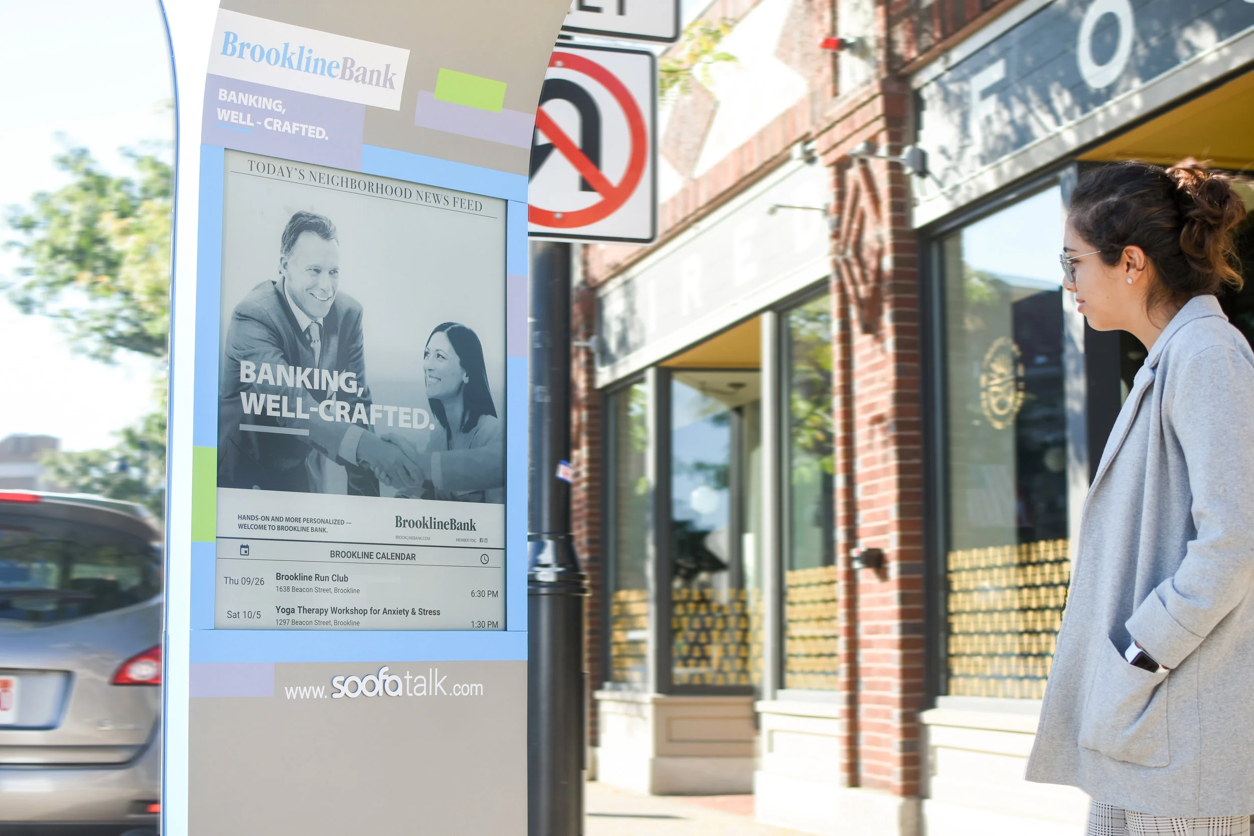 Peter Roveto, Brookline Bank’s SVP and Director of Marketing, proudly described the bank’s role as the annual launch partner of the neighborhood news feed: “Brookline Bank is pleased to have been able to help launch Soofa in Brookline. This fits well with Brookline Bank’s place in this community and we are proud to support Soofa and the Town of Brookline's vision to make our neighborhoods more connected and sustainable with state of the art technology like the neighborhood news feed."